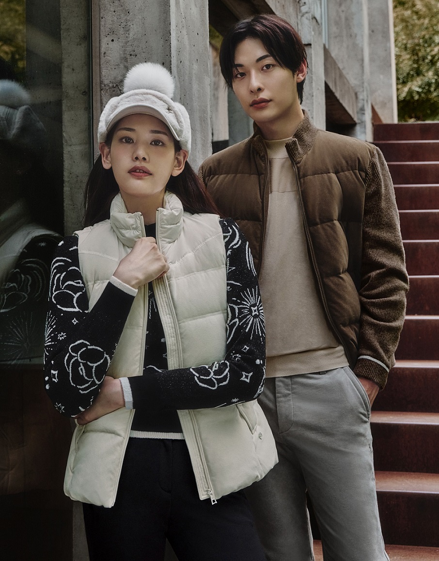 여자 모델은 코듀로이 소재로 제작된 ‘구스 다운 점퍼 베스트’와 ‘플라워 패턴 자가드 니트’를 함께 착용해 따뜻하면서도 고급스러운 스타일을 연출했다.